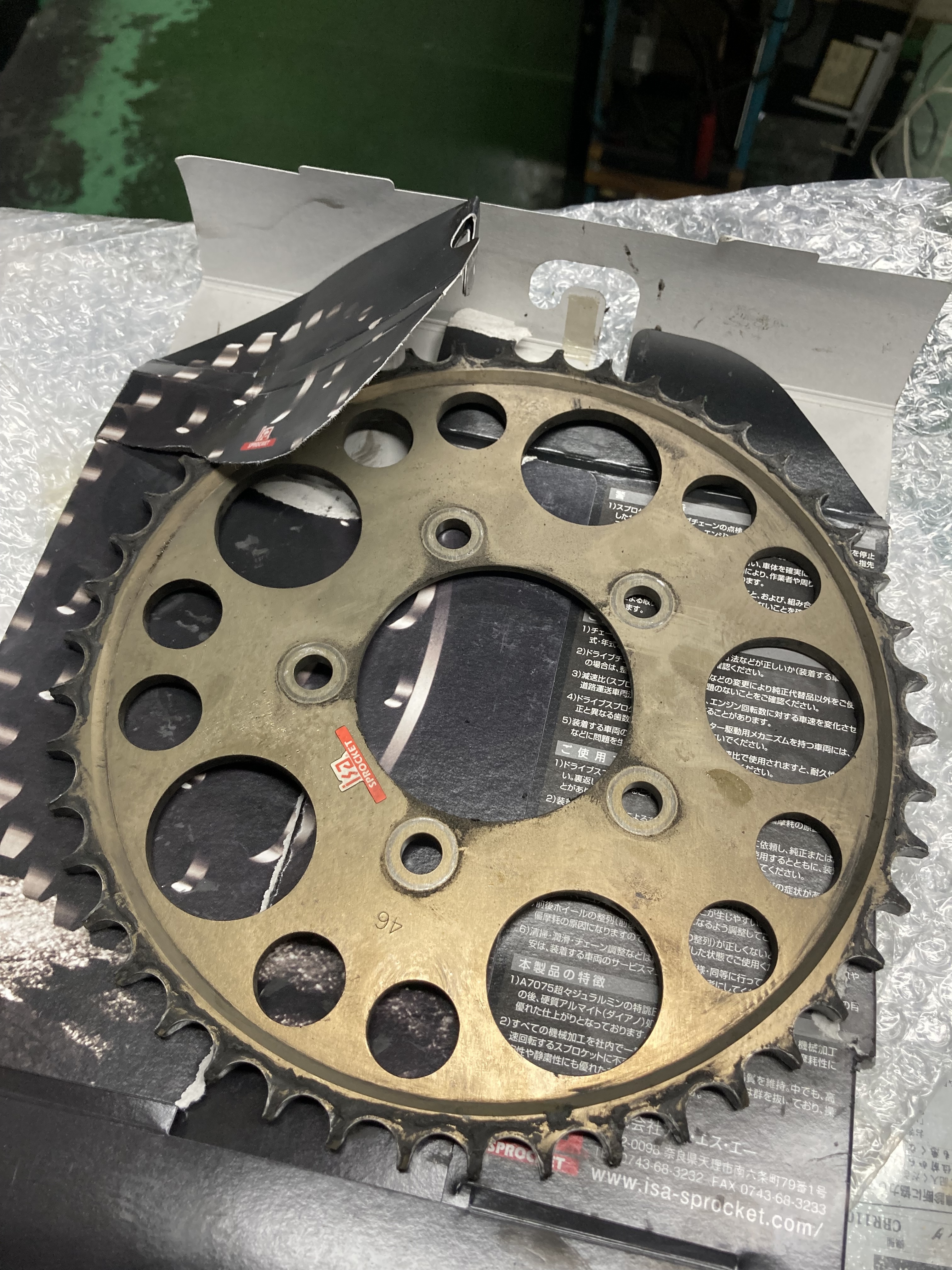 交換後のスプロケット。歯が一様に減っている訳でなく、摩耗しているのとそうでないのが混在。「それが普通です」とはT工場長談。鉄だったらもっと耐久性はあるとは思うが、マルケジーニ純正の相性を買って今回もずっとフィーリングが良い同じ46Tを選択 (ZZ-R1100の純正適合は43Tか44T)。