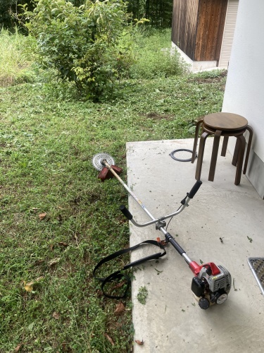 5時半出発〜Oの庭に直行。小屋で仮眠した後8時からもさっていた庭の草刈をする。