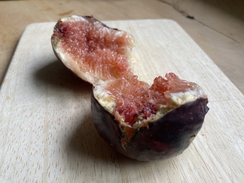 庭のイチジク、今年は冬の剪定を工夫して春先に肥料をやった効果か出来栄えが良い。先週は豊作だったが今日は熟しているのは1個だけ。包丁で切ると、中にアリが数匹いるので暫く待つ。退避させた後に水道水でサッと洗って食べる味は自己満足抜きでホント美味しい。ささやかな作業の御褒美だ。