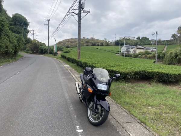 作業後かつ気温が上がってきてさすがに疲れた。缶コーヒーで小休止、気力が戻ったところでメッシュジャケットのバシャバシャ作戦実施。これで元気が出た。「やまなみロード」を使って再び北上、小倉ICは通り過ぎて大和高原広域農道をひたすら北上。この辺りの道は展望はそれ程でもないが信号も無くスピードも出る。但しアップダウンが激しく高速コーナーが多いので、飛ばすと危険かな。スピードを落として走れば気持ちの良い道。この辺りから茶畑が点在するようになった(トップの写真)。